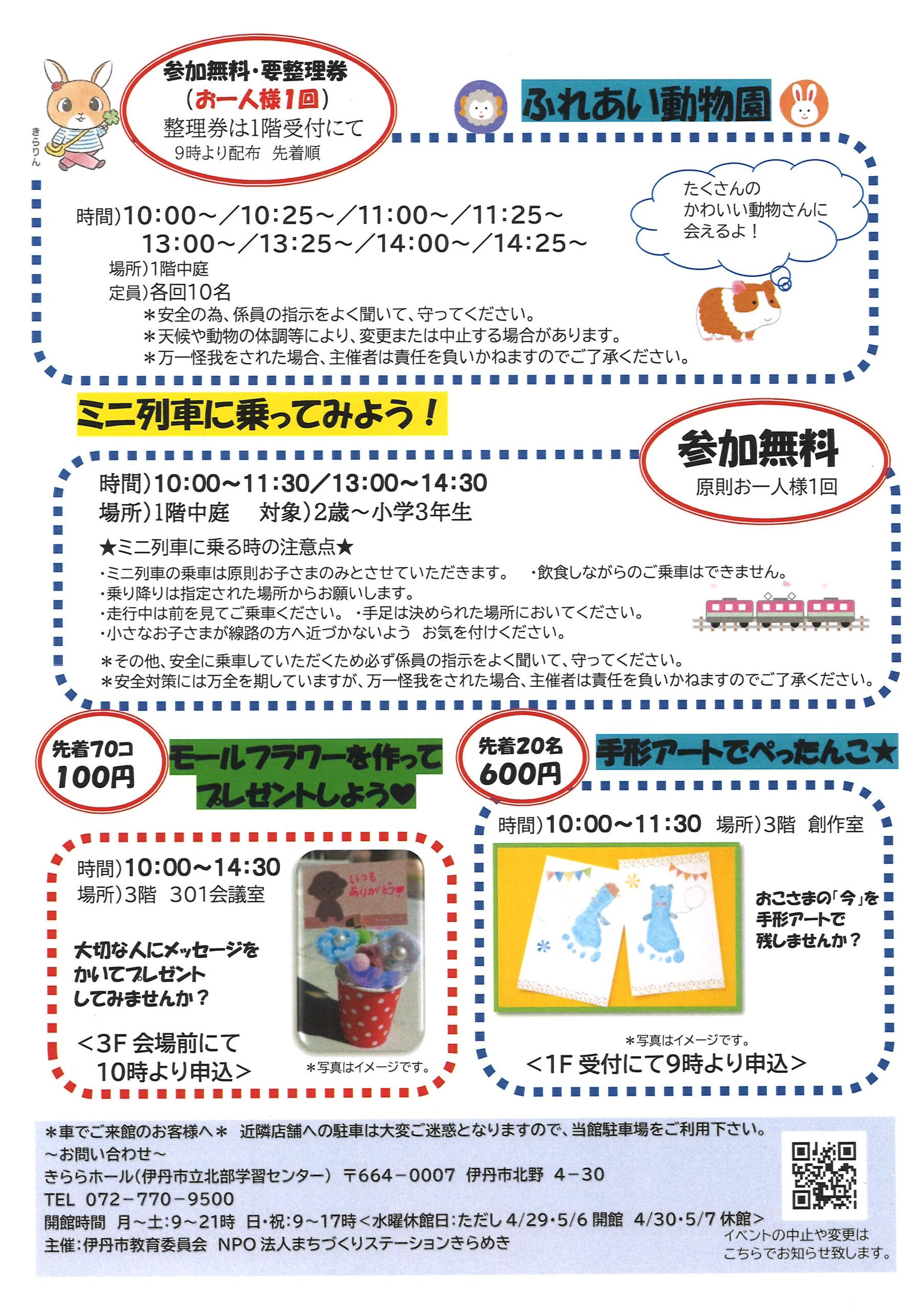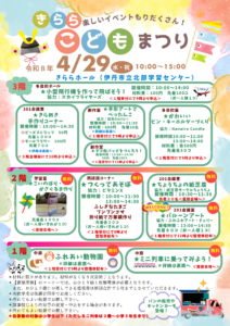 インフォメーション きらら こどもまつり 2026.04.02 ★きらら こどもまつり★ 令和8年 4月29日(水・祝) 10時~15時 楽しいイベントが盛りだくさん❣きららで一日たっぷり遊びましょう♪ *各事業の対象は小学生以下(ただしミニ列車は2歳~小学3年生まで) 詳細はこちら★ ゴールデンウイークに伴う開館時間のお知らせ 前の記事