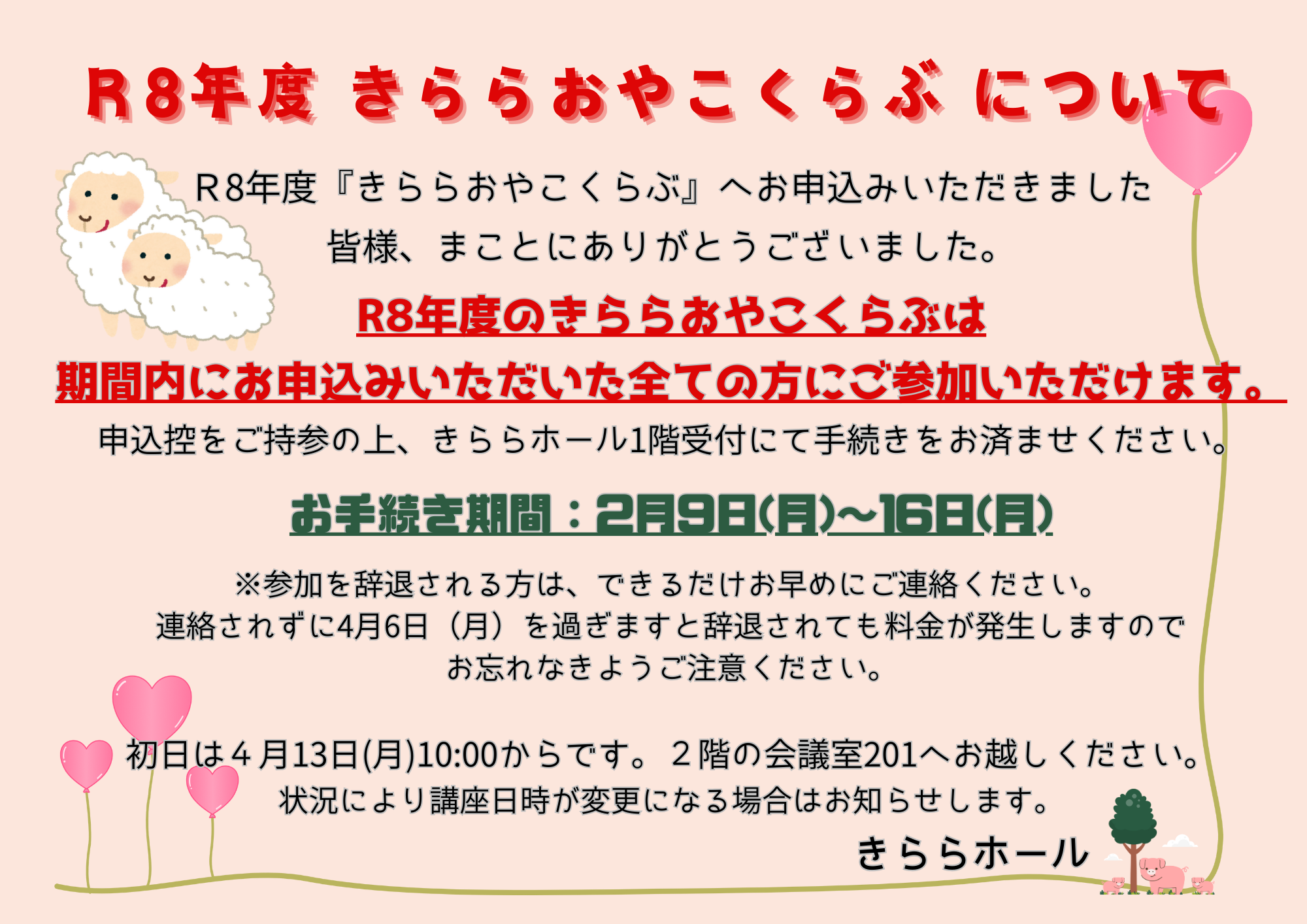 令和8年度『きららおやこくらぶ』へお申込みいただきました皆様、誠にありがとうございました。