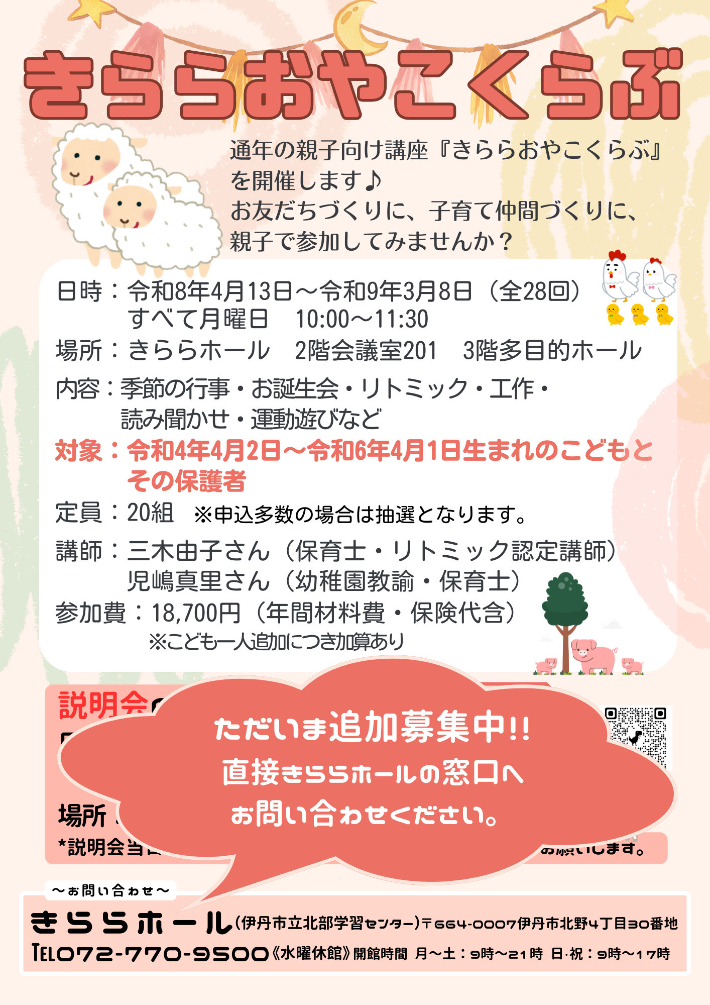 定員に若干の余裕がありますので、「きららおやこくらぶ」にご興味のある方はきららホールまでお問い合わせください。