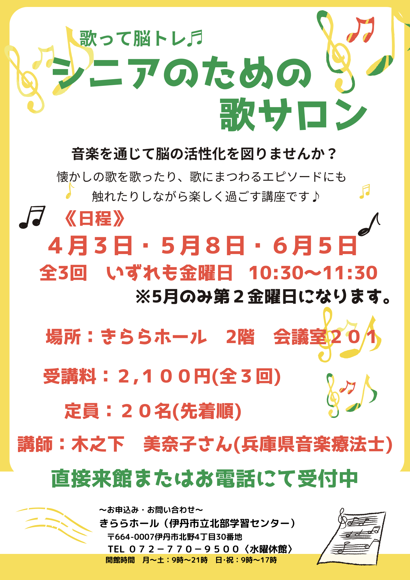歌って脳トレ♫シニアのための歌サロン 2026.03.16 4月より、新しい講座が始まります♪ 懐かしの歌を歌いながら、歌にまつわるお話を聞いたりして 楽しく脳を活性化させましょう! つくってあそぼ!工作教室4月 前の記事